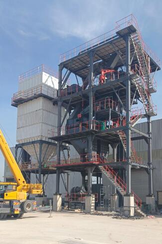 原料經(jīng)過電子秤進入到皮帶輸送機中,由全封閉的提升機將物料入到五孔碾磨制砂機內(nèi)進行破碎處理,再由空氣篩對破碎后的物料進行篩分、選粉處理,篩分后的較大物料會返回五孔碾磨制砂機中進行二次破碎,符合要求的砂子則經(jīng)過加濕拌合機由傳送帶輸送至成品倉中;篩分過程中的粉塵會經(jīng)粗細粉分離機進入到布袋收塵器內(nèi),而其中較大的粗顆粒會在粗細粉分離機的作用下,按需求在成品砂中進行回摻,細粉塵將通過風力進入到布袋收塵器,作為副產(chǎn)品進行使用。